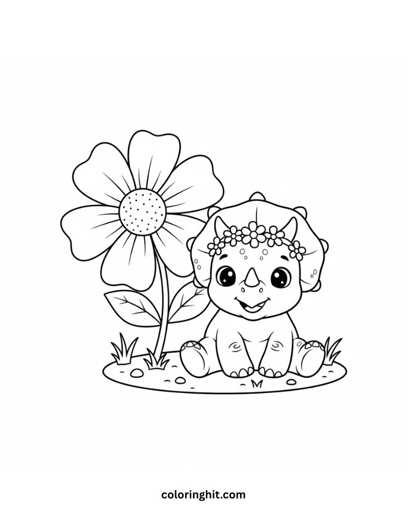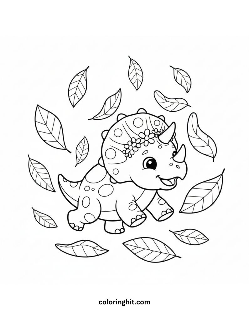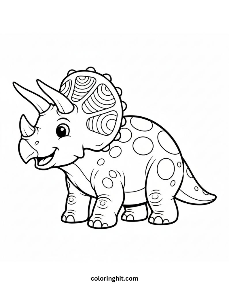 The Triceratops is a horned dinosaur known for its large bony frill and three facial horns. Because it was a plant eater, Triceratops scenes work great with leaf patterns, flowers, and soft landscapes that are easy to color. These pages help kids practice big motor strokes on the frill and careful coloring on the face and horns.